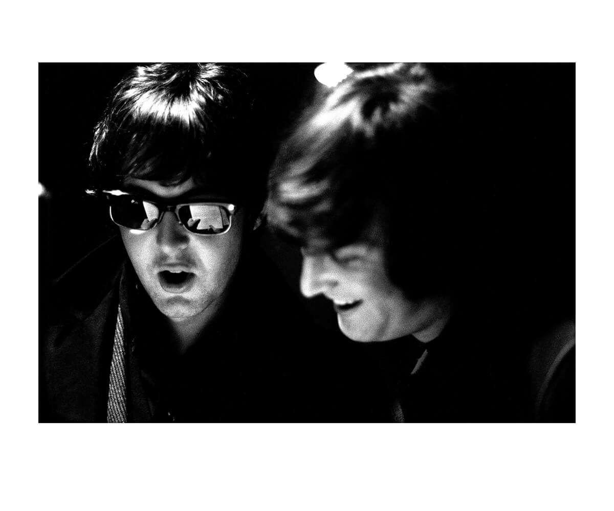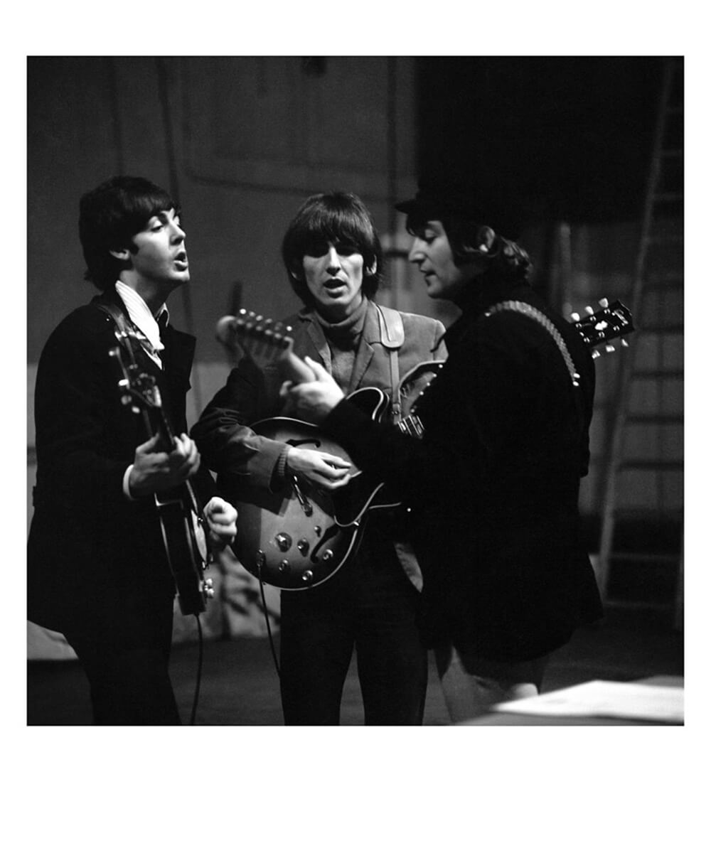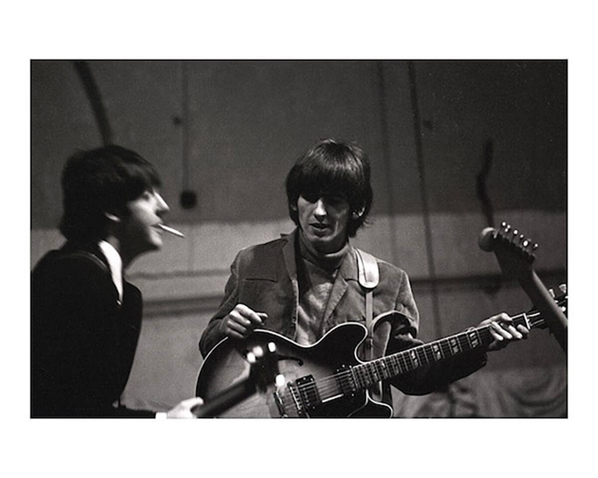 写真「ジョン・レノン、ポール・マッカートニー、ジョージ・ハリスン - ドンマー・リハーサル・シアター、ロンドン - 1965年」【オリジナル・プリント/ロバート・ウィテカー・フォトグラフィーのエンボス入り】
